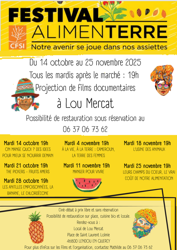 Pendant le festival Alimenterre, nous proposons chaque mardi à la suite du marché une projection d'un film documentaire et la possibilité de se restaurer sur place. L'assiette composée est à 12€ hors dessert et produit à partir de produits bio et locaux.
