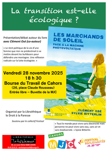 Dans le cadre du Festival des Solidarités (Festisol), La Libraithèque, Le Droit à la Paresse invite, le vendredi 28 novembre, à 18h30, à la Bourse du Travail de Cahors (place Rousseau), Clément Osé, co-auteur, à venir parler de son livre "Les Marchands de Soleil, Face à la machine Photovoltaïque".